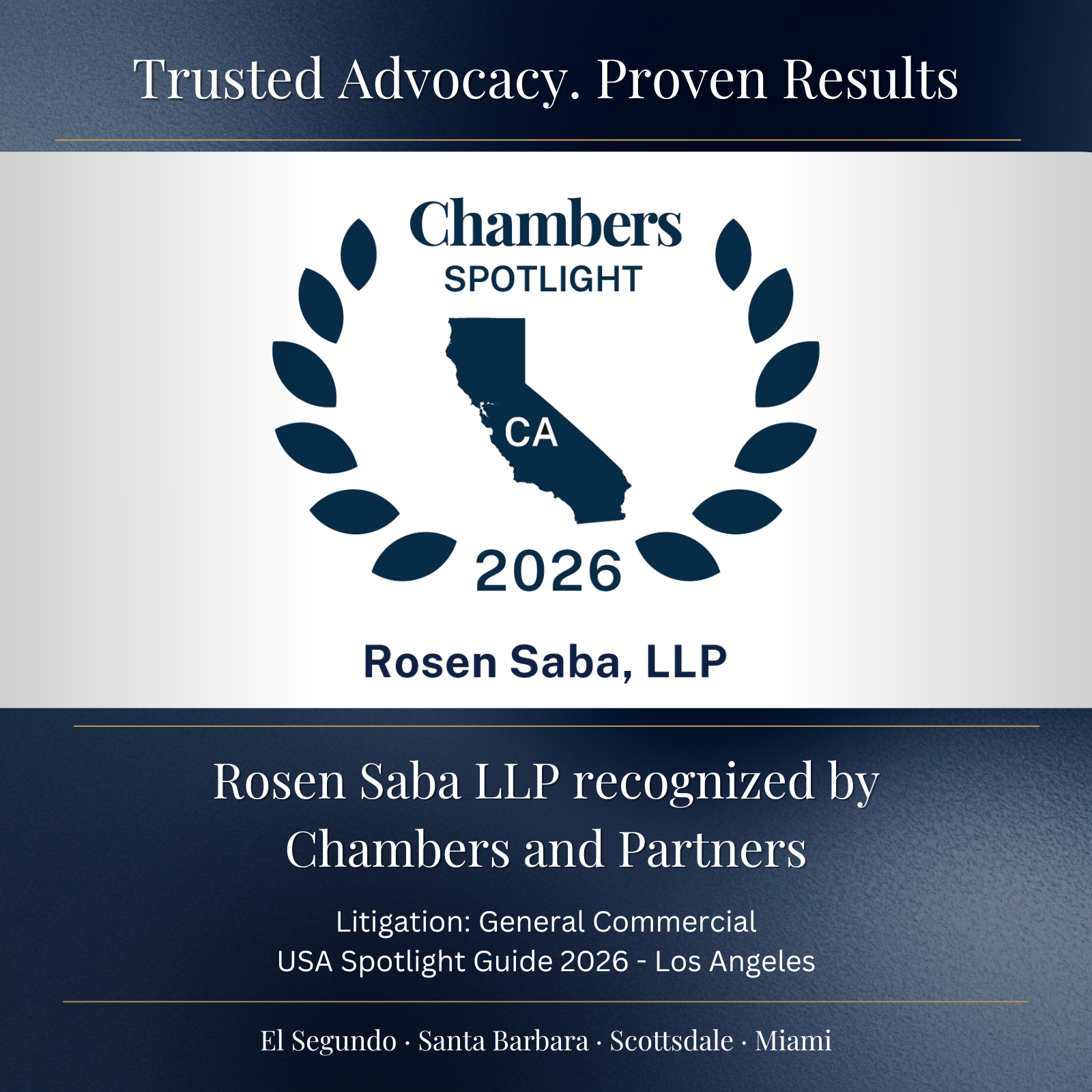 Rosen Saba LLP is honored to be recognized by Chambers and Partners in the 2026 USA Spotlight Guide for Litigation: General Commercial in Los Angeles.
